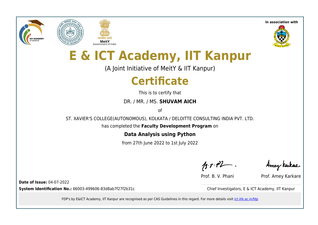 Shuvam successfully completed a certification course on Data Analysis with Python, gaining comprehensive knowledge of key concepts such as data wrangling, exploratory data analysis, and data visualization. The course provided hands-on experience with Python libraries like NumPy, Pandas, Matplotlib, and Seaborn, enabling him to analyze, interpret, and visualize data effectively. Through practical projects, Shuvam enhanced his skills in extracting insights from datasets, creating meaningful visual representations, and applying statistical techniques to support data-driven decision-making.