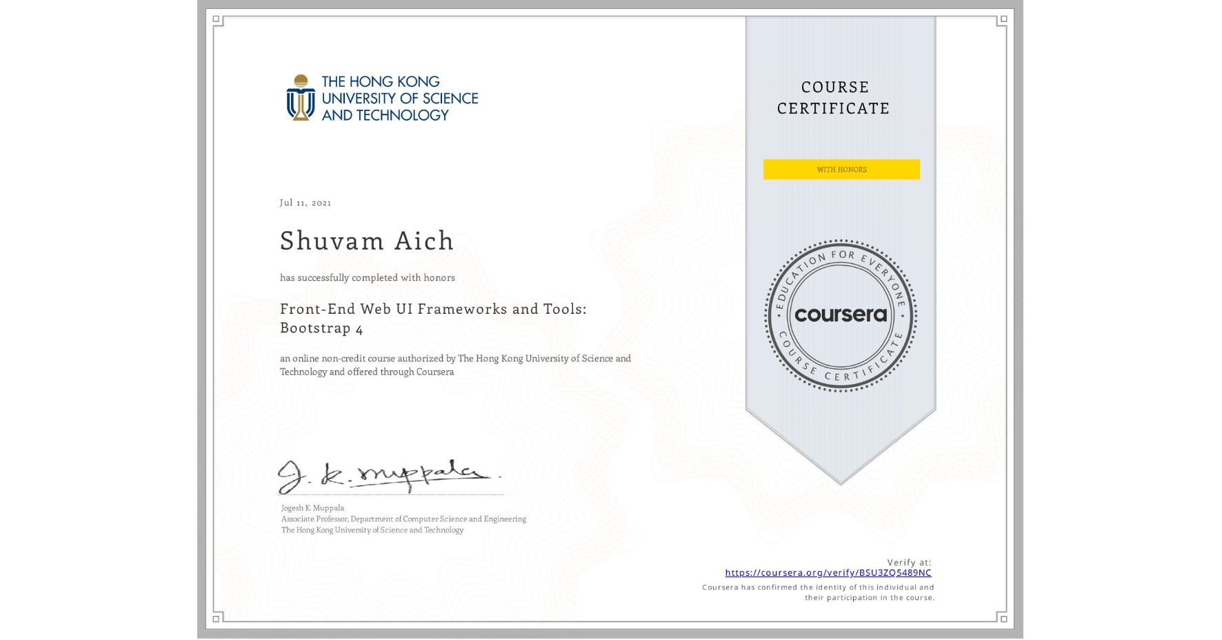 Shuvam completed the “Front-End Web UI Frameworks” course on Coursera, gaining practical knowledge of building responsive and mobile-first web applications. The course covered essential features of the Bootstrap framework, including the grid system, navigation components, utilities, and customization options. Through hands-on projects, Shuvam mastered creating dynamic layouts, implementing interactive design elements, and enhancing the user experience. This certification strengthened his web development skills, enabling him to build modern, visually appealing, and responsive websites efficiently.